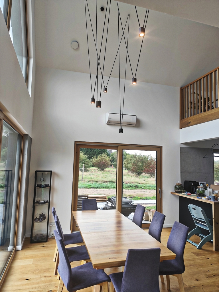 Lampa wisząca do wysokich pomieszczeń ze skosami.